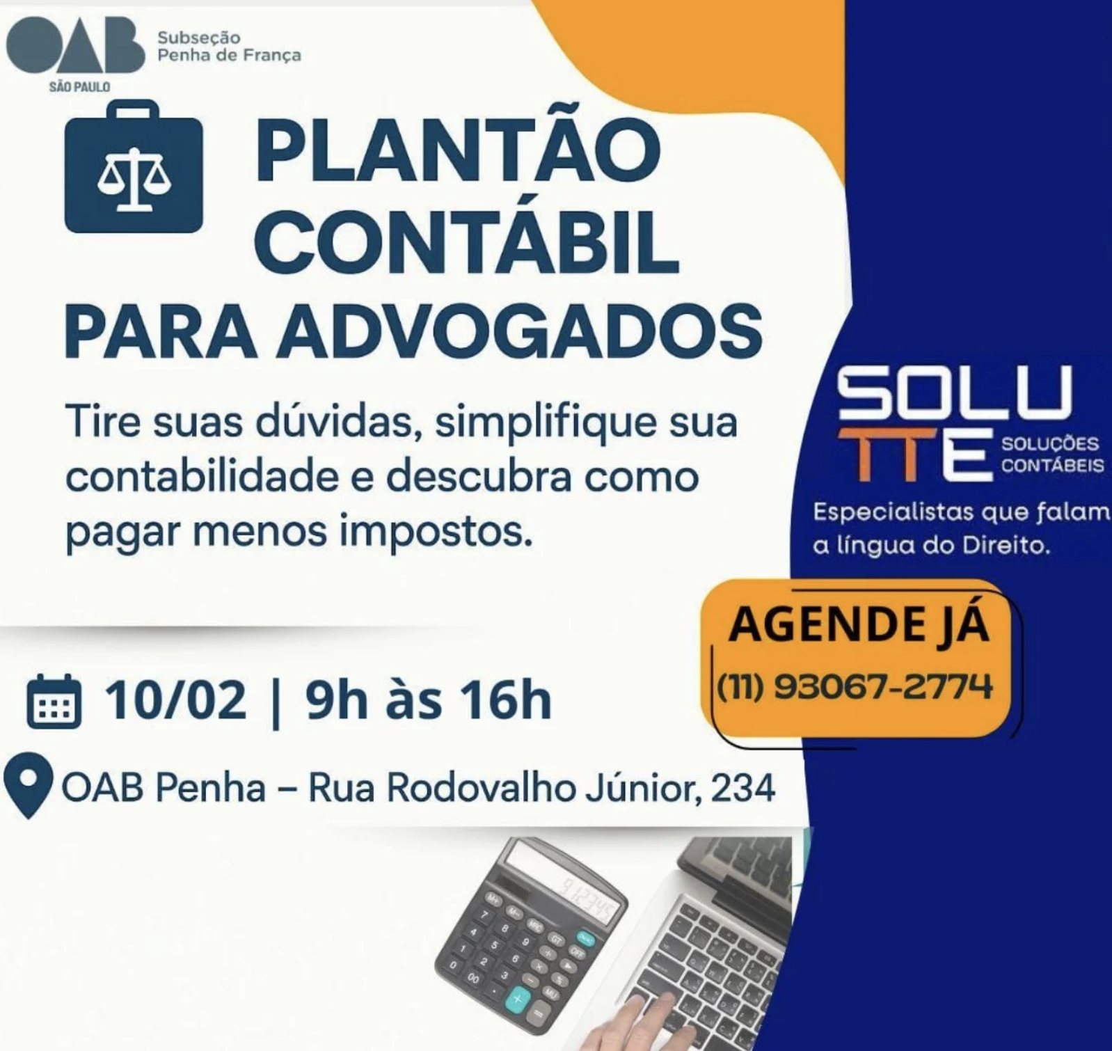 Tire dúvidas sobre CNPJ, sociedade unipessoal, impostos e organização financeira. Resolva tudo em um só lugar, no Plantão Contábil gratuito da OAB Penha.